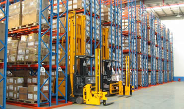 此類倉庫中,低、高位倉庫大多用前移式電瓶叉車、平衡重電瓶叉車、三向叉車進(jìn)行存取作業(yè),貨架較矮時(shí)也可用電動(dòng)堆高機(jī),超高位倉庫用堆垛機(jī)進(jìn)行存取作